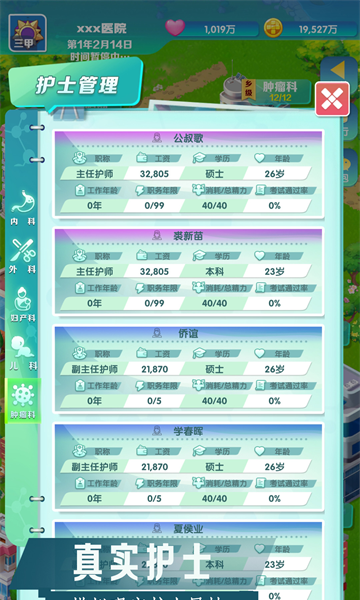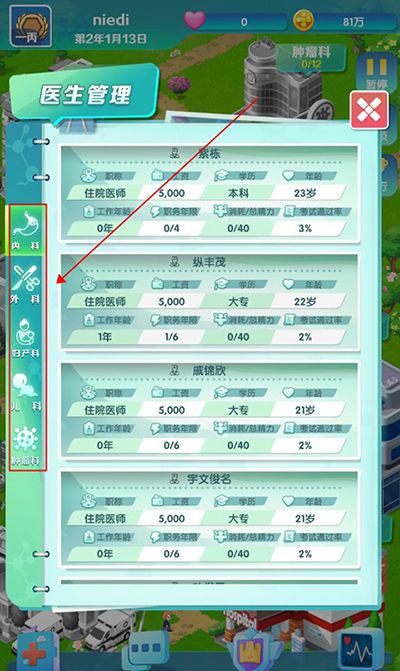 1、游戏内有着内科、外壳、妇产科、儿科、肿瘤科五种医生类型,玩家可以对每种科室的医生进行招聘,增加医院人手;