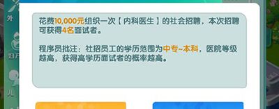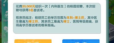 (2)名校招聘其实更适合早期用的,因为医院等级越高,名校招聘的费用就越高;使用名校招聘的目的是为了招聘“硕士”学位且临床职称为“住院医师”的医生,在二级丙等前最好每个科室都有两个这样的医生,这些医生就是我们的重点培养对象,只要这些医生即将报考临床职称考试,就对他各种进行培养,直至这些医生升级到主任医师;至于为什么不招博士和博士后,是因为博士的最低临床职称为“主治医师”,博士后的最低临床职称为“副主任医师”,而在游戏中的主任医师初始临床职称越低其月薪就越低(这可以很大程度的节约医院成本);
