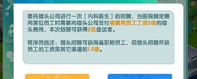 (3)猎头招聘的医生工资是普通招聘医生工资的1.5倍,所以想要做高月利润的话,猎头招聘是能不用就尽量不用,除非在升级医院时有一个科室就缺了一个符合条件的医生,这时候用猎头招聘可以应一下急,待医院升级后也推荐将其解雇的;