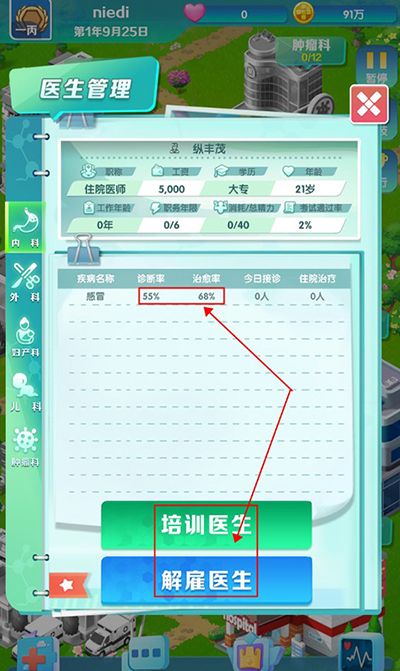 3、玩家在成功聘用医生后还可以查看医生的职业以及治愈率,如果治愈率过低,可以对其进行培训,提高水平,如果过低,可以将其直接开除。