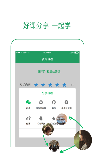 2、课程分享,支持推荐课程到朋友圈、微博、QQ;