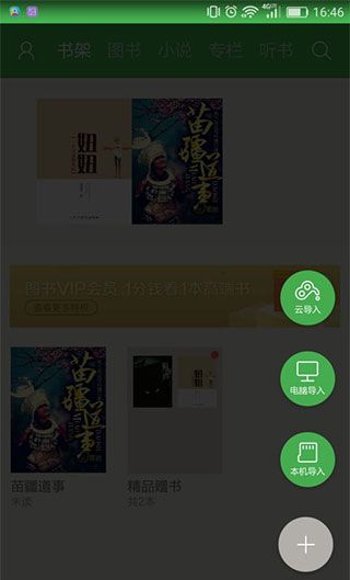 3、登录主页后,您可以看到以前读过的小说。在右侧,有一个+,您可以从云、计算机或本地计算机导入它们。