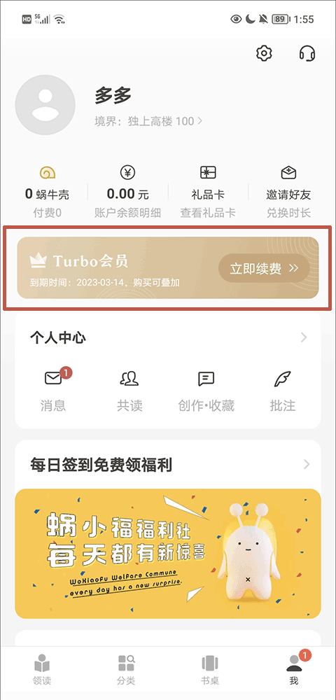 1、首先,打开在本站下载安装好的软件,在我的界面找到并点击红色方框内的“立即续费”选项;