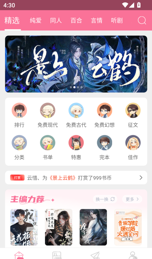 1、首先下载安装app,进入其中选择“言情”或“纯爱”即可切换为首页,如下图。