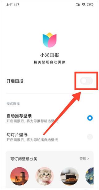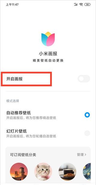 4、找到“开启画报”后,点击旁边的“开启键”画报就开启成功了。