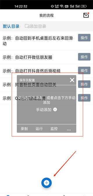 1、打开触控精灵软件,在流程界面有一个添加按钮打开,会弹出一个浮窗,我们就要在这个小浮窗上进行操作,如果没有弹出这个浮窗,就需要进行对应用的设置,根据提示将浮窗的权限打开即可。