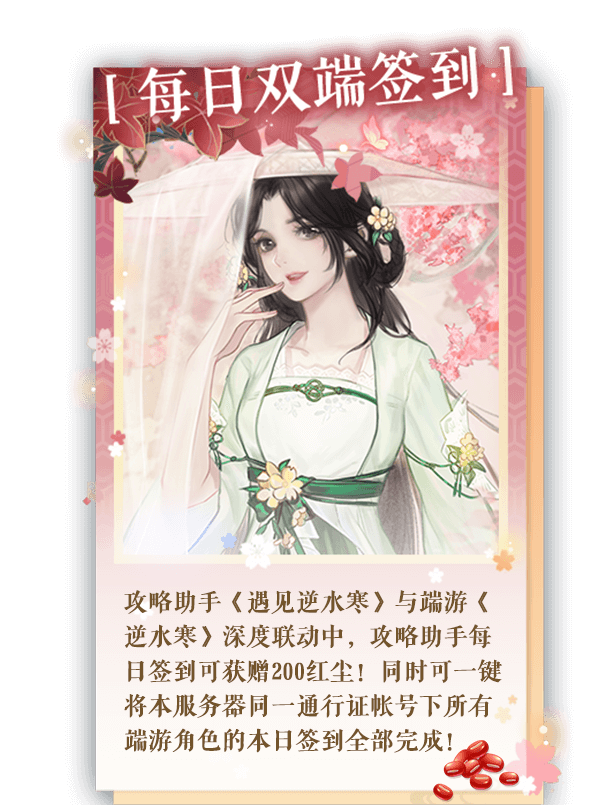 4、攻略助手《遇见逆水寒》与端游《逆水寒》深度联动,攻略助手每天签到可获赠200红尘!同时可一键将本服务器同一通行证下所有端游角色的本日签到全部完成!