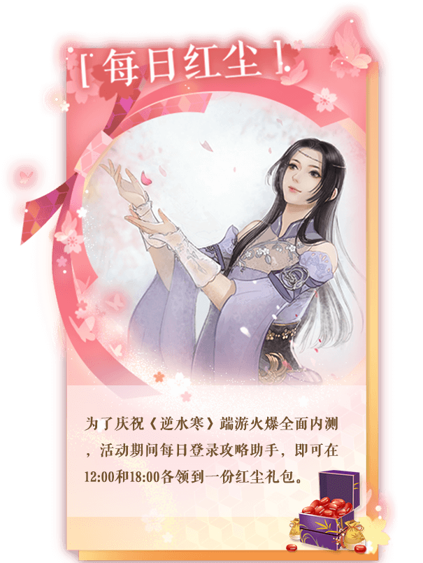 为了庆祝《逆水寒》端游火爆全面内测,活动期间每日登陆手游,即可在12:00和18:00各领一份红尘礼包。