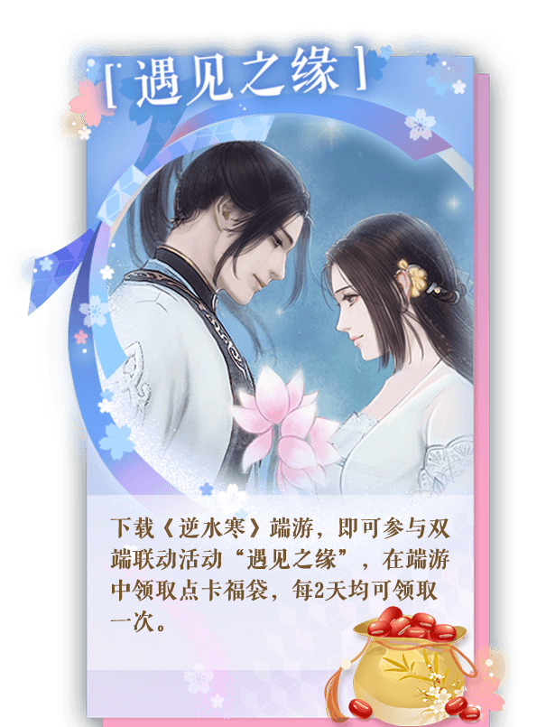 2、下载《逆水寒》端游,即可参与双端联动活动“遇见之缘”,在端游中领取点卡福袋,每2天均可领取一次。
