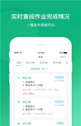 4、实时查阅作业完成情况,一键发布家庭作业;