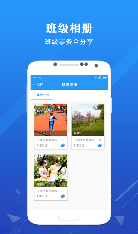 3、班级相册:查看老师发布的班级相册,点赞互动;
