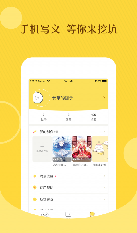 3、小说创作:每个人都是小说创作家,在这里人人可进行创作作品,发布小说阅读。