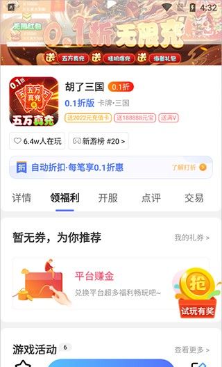 3、丰富的福利活动:平台经常举办各种福利活动,如签到礼品、充值回扣、限时折扣等,让玩家享受更多福利。