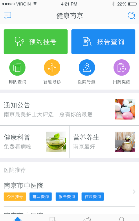 1、预约挂号:支持南京地区各大医院的免费预约挂号服务,患者随时随地轻松预约挂号;