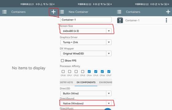 2、在导入游戏之前我们需要创建一个容器,通过首页点击“+”创建,然后选项设置,这里需要根据你要导入的游戏来设置,例如分辨率大小、Direct sound 和 Direct Music等,确保导入游戏后画面大小正常、背景音乐流畅运行;