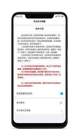 电池状态提醒app一款充电提醒的app,软件占用内存小巧,使用方便,当充电满了之后会有语音提示,当电量少的时候也会相应的有电量提示,非常的方便,低电量提醒您,保护您的电池,充满电时提醒,延长电池寿命,显示即时电量,让您更了解您的手机,不用怕忘记手机充电而对手机造成的损害了,开启电量助手,充满电时,自动提醒您拔去电源。