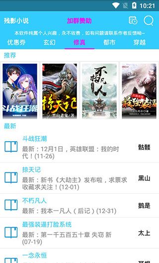 残影小说app是一款帮助用户阅读免费小说的手机资讯软件,它利用大数据采集技术将国内优秀小说资源进行统计分类,并根据用户需求分设玄幻、修真、都市、穿越、网游、科幻等栏目,无论是圣墟、太古神王、一念永恒、不朽凡人等热门推荐,还是斗战狂潮、择天记、大劫主、道君、飞剑问道等名家名作,海量精彩内容这里应有尽有,只为用户带来最佳的阅读体验。