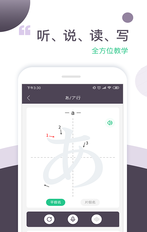 通过发音、跟读、书写练习,全方位掌握每个假名的读法,写法。