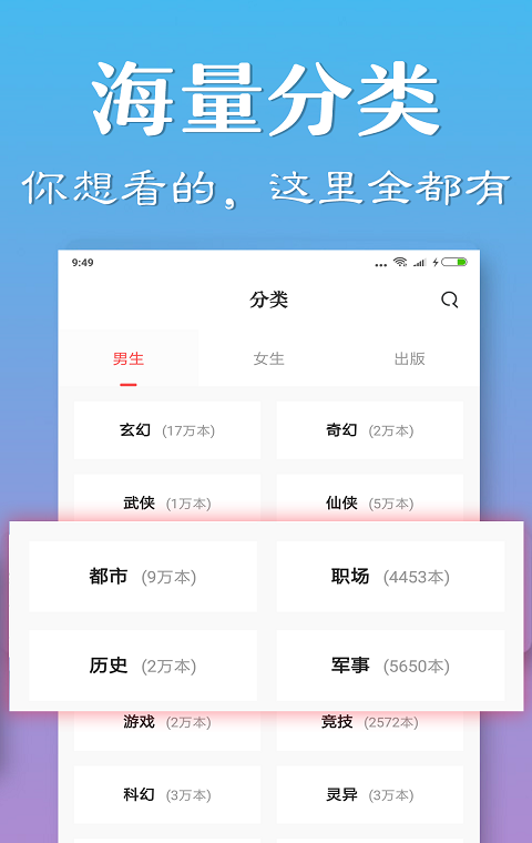 分类齐全:几十种不同类别的选择,百万个不同体验的小说。