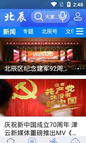 “首页”版块设置“新闻”“专题”“北辰号”“文化”“公告”“美食”等6个频道,以不同形式提供生动、鲜活的新闻资讯。