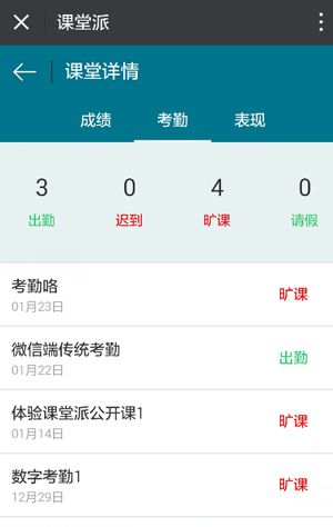3、在考勤模块,显示每次考勤的状态,并统计出学生出勤,迟到,旷课,请假的次数;