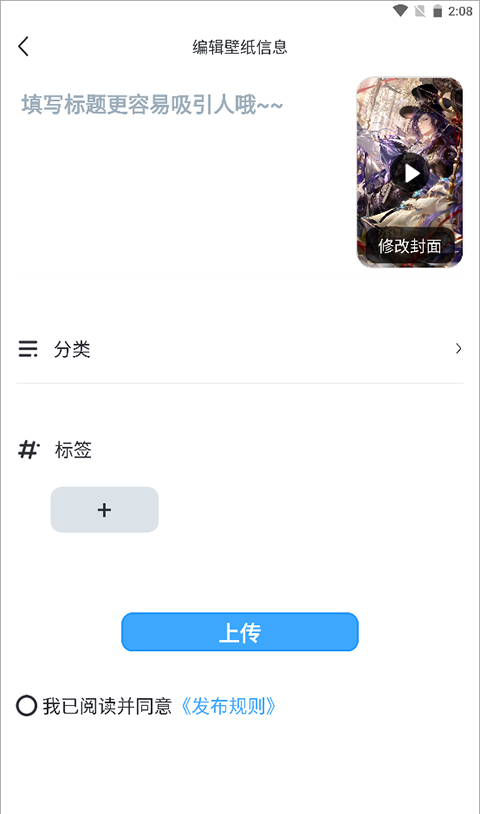 3、然后选择好自己的动态壁纸,接着为其提供撰写好标签,名字等信息,点击【发布】即可。