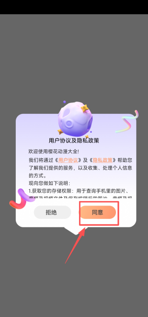 1、首次启动应用,请在用户协议页面点击同意选项。