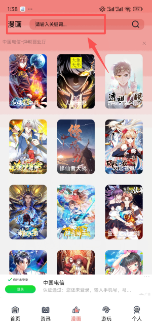 3、登录后通过顶部漫画搜索栏,输入关键词查找作品。