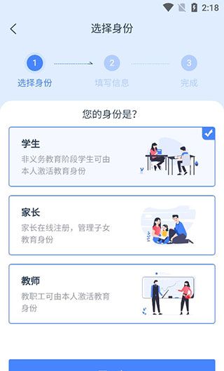 2、选择登录身份,学生、家长或者教师,点击下一步。