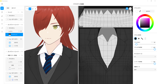 4、左边是实时的3D模型,右边是贴图摊开的样子,最右边是选择画笔和颜色。在左边选择一下要作画的图层。这里有三层,Default Image是原本的贴图所在的图层,Guide这层则不会显示在最终结果中。我个人习惯直接使用Layer这一层。那么,在最右侧一栏选好颜色与画笔,在右边的贴图上写几个字,尝试一下吧。然后再把鼠标挪到左边的3D模型上画一画。没错,模型上也是可以直接作画的。同之前改变脸部部件的形状一样,我们在左边的侧边栏一路往下设置。Mouth是嘴内部、Scleras是眼白、Eyeline是眼线、Eyelashes是睫毛、Eyebrows是眉毛……这些其实不太需要修改。有兴趣的话,你可以修改一下眼线、睫毛与眉毛的颜色。Base Color是基本色,Shade Color是阴影部分的颜色。然后就到了非常重要的Irises——虹膜,也就是眼睛中央有颜色的部分。