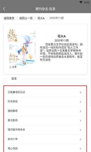2、如果在推荐中看到有喜欢的期刊就可以点击进入选择观看,比如进入花火,可以选择想要的;