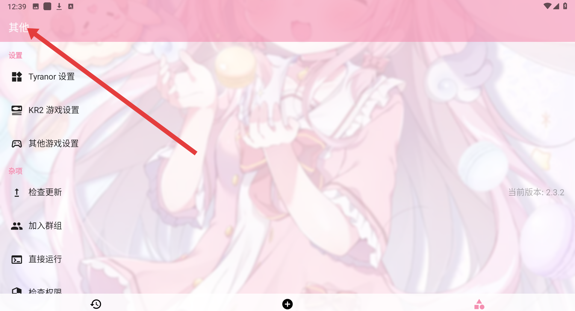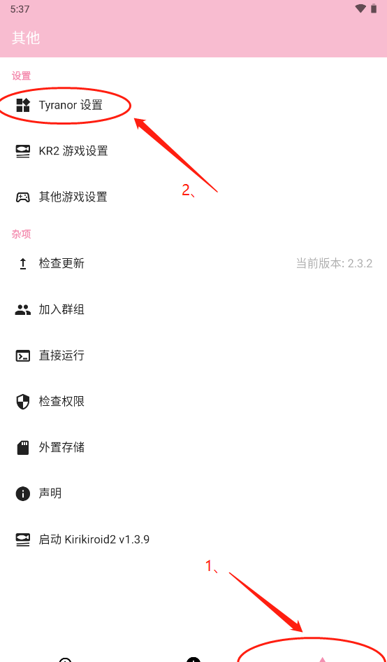 4、点击其他板块,可进入设置界面,查看Tyranor设置、KR2游戏设置等,还可进行检查更新、加入群组等操作,提升应用使用体验。