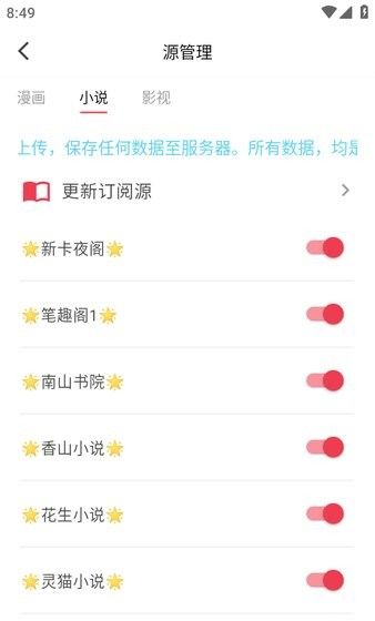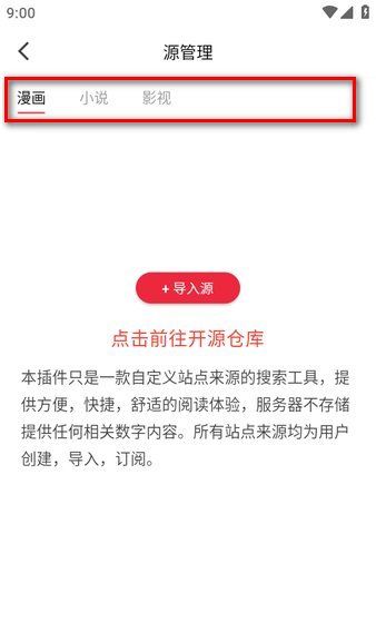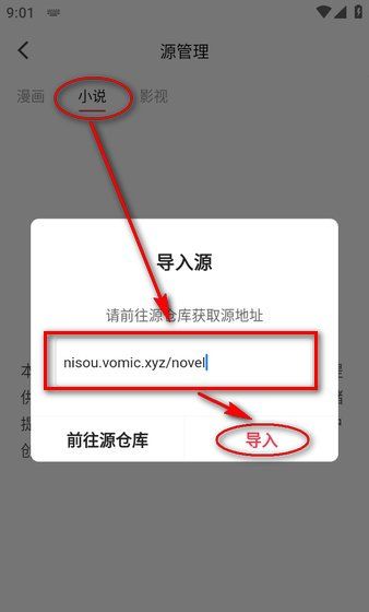 3、以“小说”为例,点击中间的“+导入来源”按钮,复制粘贴上面小说的来源地址,点击“导入”。