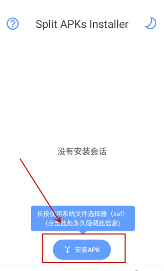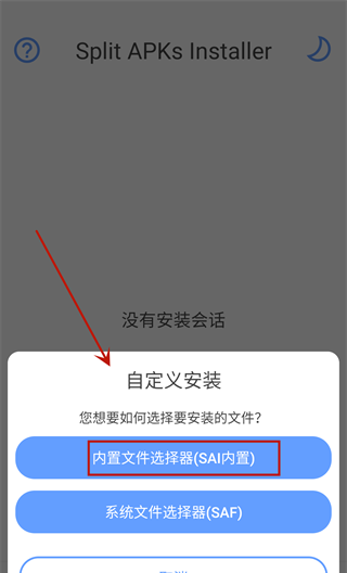 3、弹出安装提示,包括内置文件选择器(SAI内置)和系统文件选择器(SAF),用户可根据需求选择使用,这里以系统文件选择器(SAI内置)为例