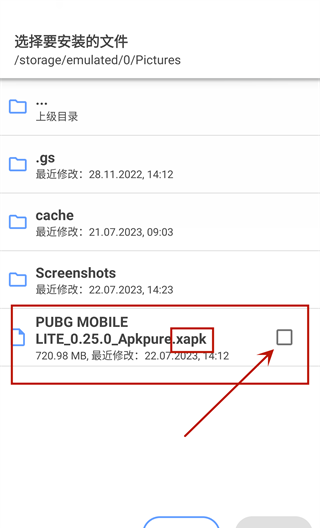 4、进入文件选择界面,搜索或者点击需要安装的文件,小编这里以pubg为例,可以看到这里有一个后缀为xapk的安装包