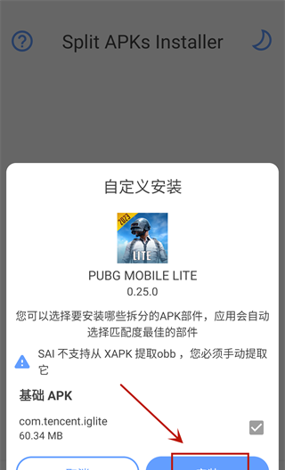 点击 "安装APKs" ,选择 base APK 以及需要的Config APK 或包含以上全部。zip/.apks压缩包,然后点击 "安装" 。