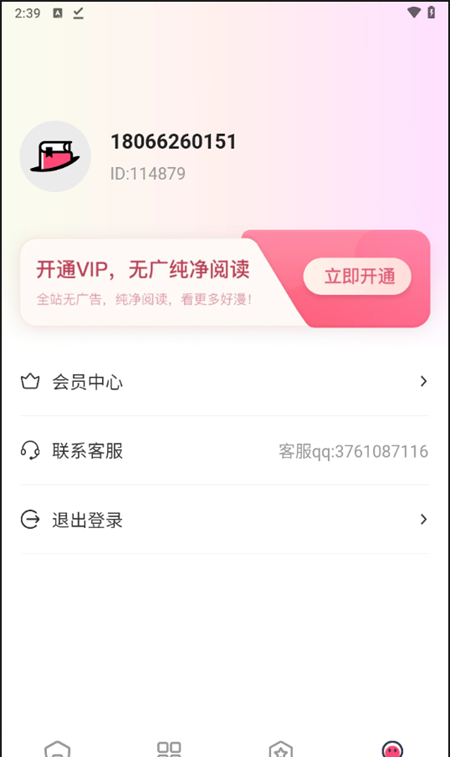 4、在我的界面中,我们可以完成帐户注册和登录操作,以及VIP激活操作,这样我们就可以体验到一个没有广告的纯粹阅读环境。