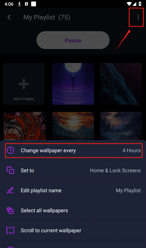 6、另外点击右上角三点,还可以自定义设置每次更换壁纸的时间