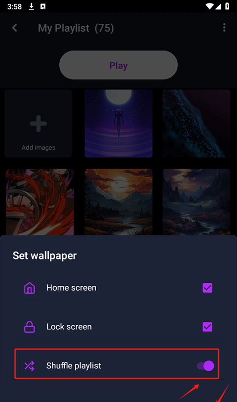 4、然后选择将这些壁纸设置为壁纸、锁屏或全部都设置,并将三个自动播放功能打开,设置完成后点击play