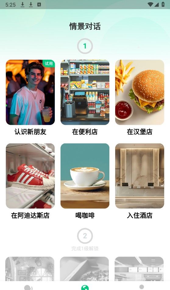 4、点击“情景”栏目,提供了很多的情景对话,方便用户进行练习。