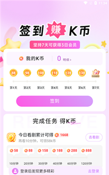 3.每天只需要签到就可以免费获得一个会员,每次下拉刷新都会呈现最新的和你喜欢的视频。