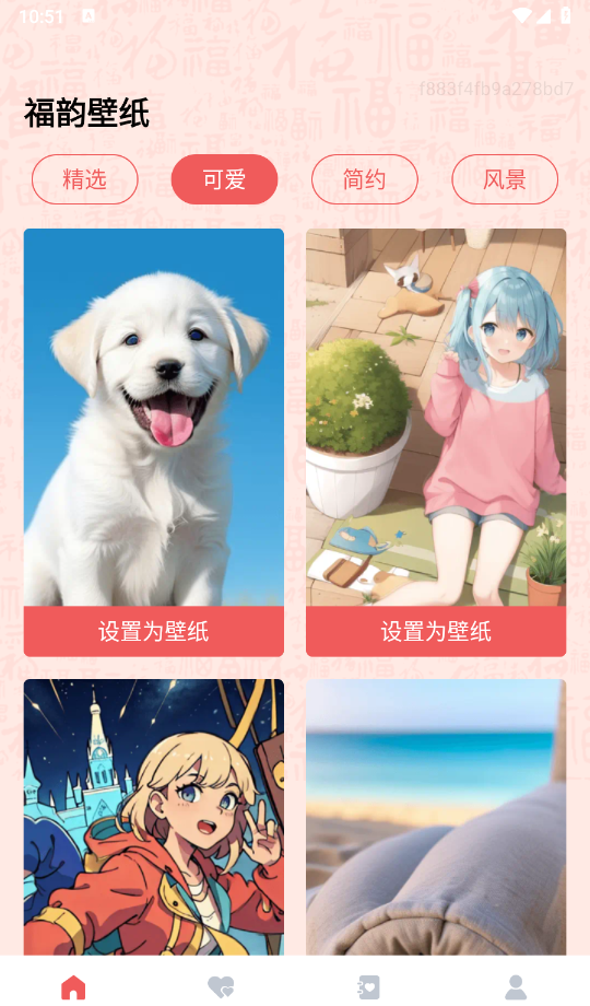 2、进入软件,首页有很多的壁纸资源分类,包括了精选、可爱以及简约等不同的类型。
