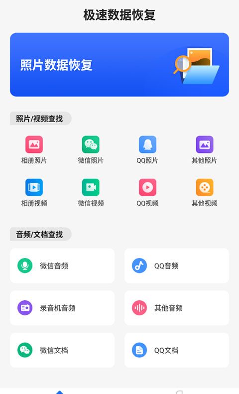 《极速数据管理兔》让恢复数据变得更加简单,这个软件可以将用户误删的内容一键快速恢复,并且只需要几个简单的步骤,就可以拯救用户手误造成的后果。是一款功能强大的数据管理平台,可以帮助用户随时快速恢复丢失的数据。无论是意外删除的消息还是照片和视频,都可以通过这个平台快速恢复。整体界面设计相当简单,所有功能都放在主页上,用户只需根据自己的需要进行选择和使用。