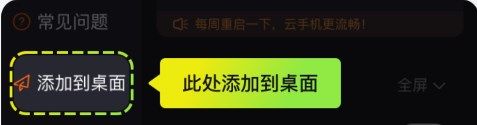 在云手机菜单中点击"添加到桌面”可将当前云手机作为快捷方式添加至手机桌面,您可以直接从桌面进入云手机(部分机型需要先为盒子开启创建快捷方式权限)。