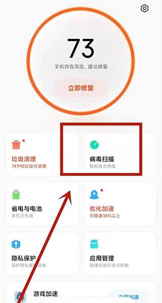 1、在手机管家中,选择一下页面的病毒扫描选项;