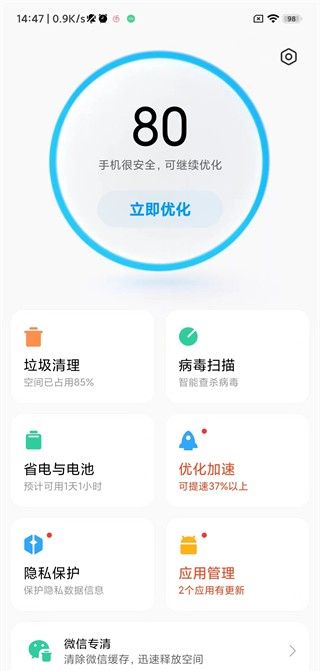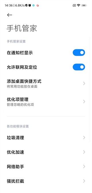 小米手机管家是一款手机安全防护软件,软件能够有效帮助用户清理诸多手机中的缓存垃圾,及时恢复手机存储空间,让你的手机运行更快更稳定,不会再出现游戏卡顿或者内存空间不足的情况。包含了一套强大的保护和优化工具,应用程序锁定,数据使用,安全扫描,清洁,电池节约,阻止列表,还拥有垃圾请里、病毒扫描、电池性能、优化加速等功能,一键即可清理手机空间,让手机运行更加流畅。