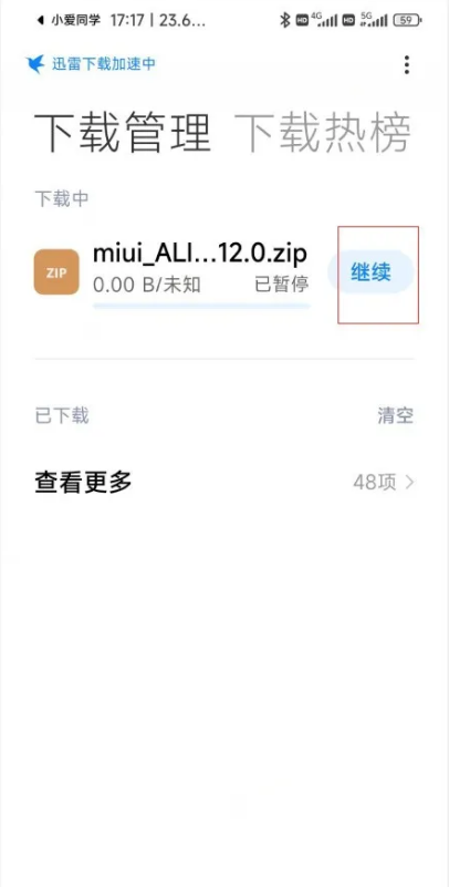 3、打开下载管理,找不到可以使用小爱同学帮助打开,点击继续下载