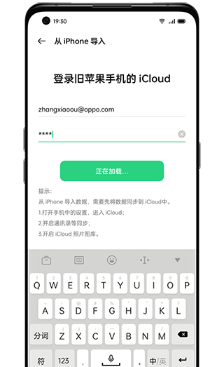 1、打开OPPO手机搬家应用,并选择”从iPhone导入”。输入苹果手机的iCloud账号和密码;