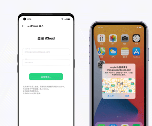 苹果手机上的iCloud账号登录请求弹窗,选择"允许”。然后在OPPO新手机上填写iCloud的验证码,即可连接成功;