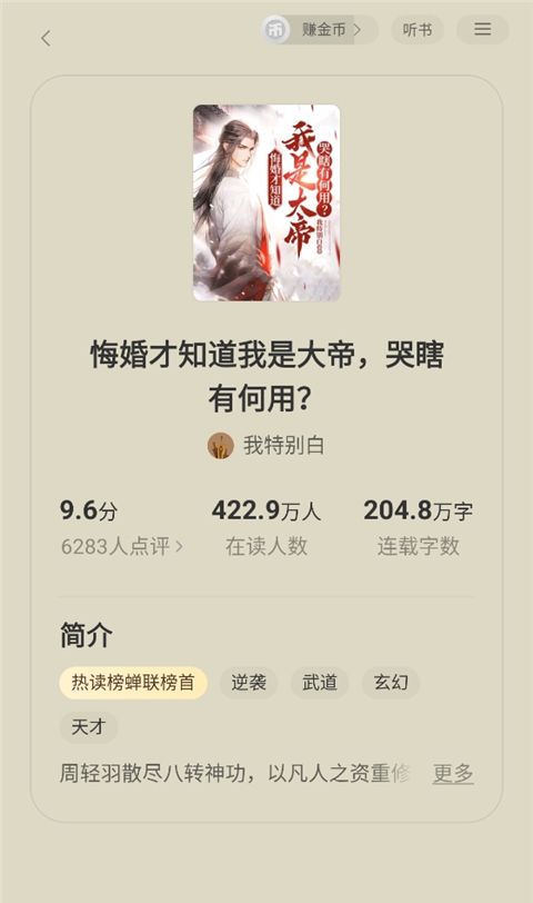 4、选择相应的书籍后,可看到评分、在读人数、字数、简介等详细的内容,